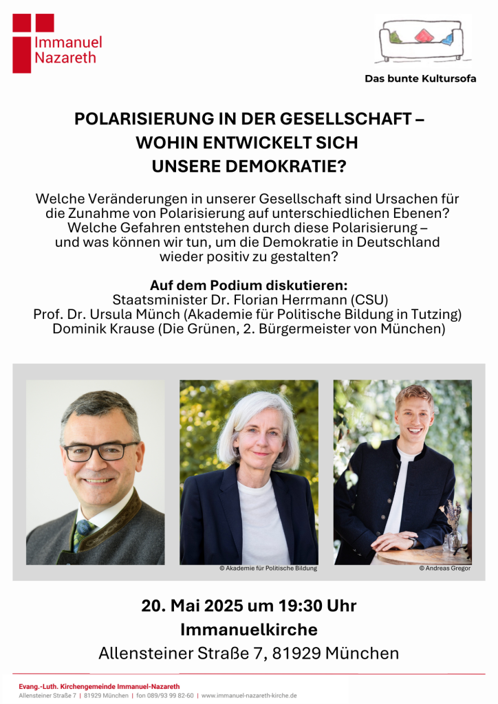 Für Anregungen, Fragen und Diskussionsbeiträge ist das Team des bunten Kultursofas zu erreichen unter: kultursofa@immanuel-nazareth-kirche.de